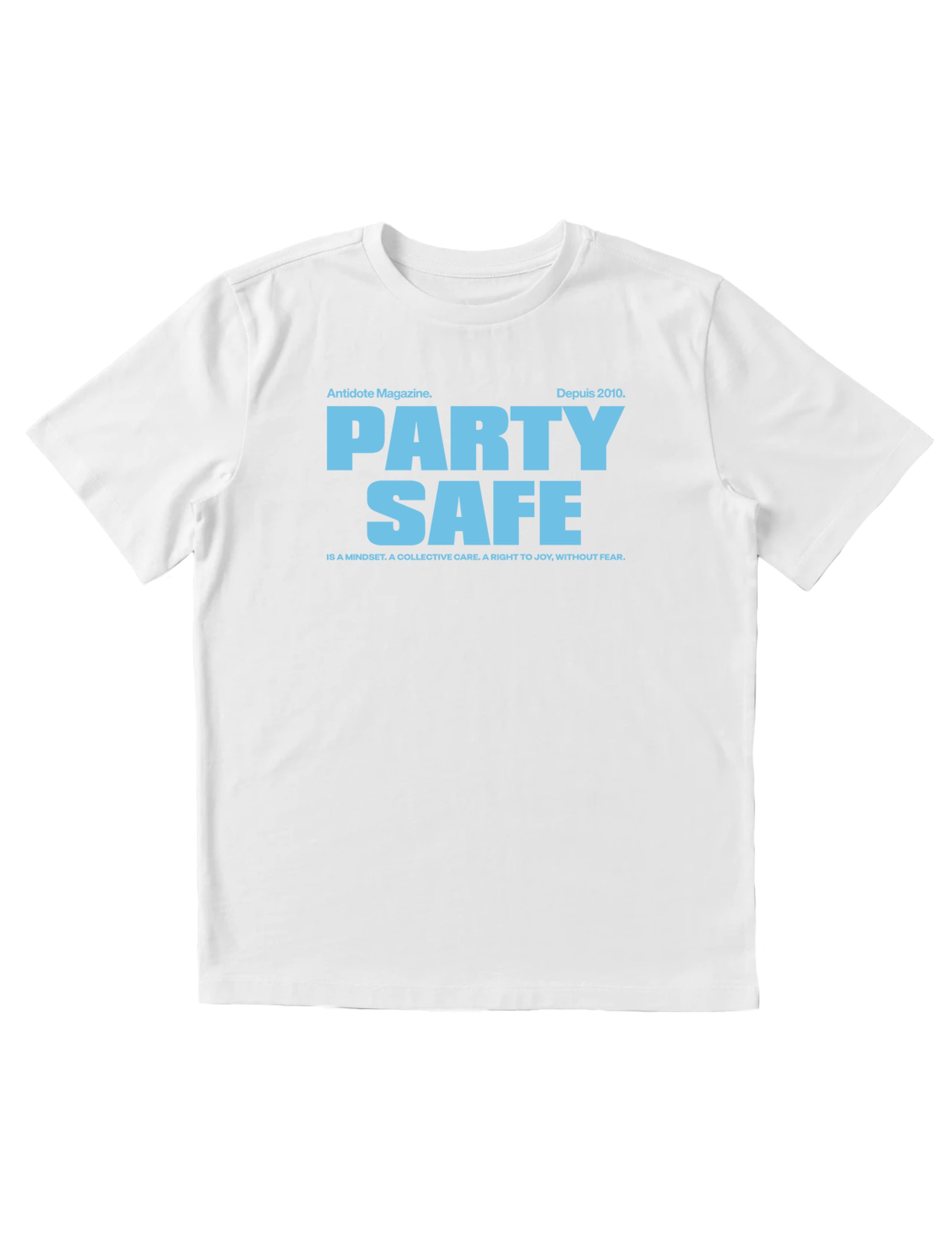 À l’occasion de son partenariat avec plusieurs grands festivals dont We Love Green et en clin d’œil à ses soirées qui fédèrent sa communauté, Antidote imagine un merch « Party Safe » afin de prôner une attitude individuelle et collective respectueuse, pour faire la fête dans la joie et non la peur.
